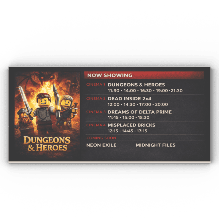 Eine große bedruckte 8×16 Klemmbaustein-Fliese (ca. 6,4 auf 12,8 cm) aus unserer “Kino” Reihe, geeignet für viele verschiedene Szenarien.